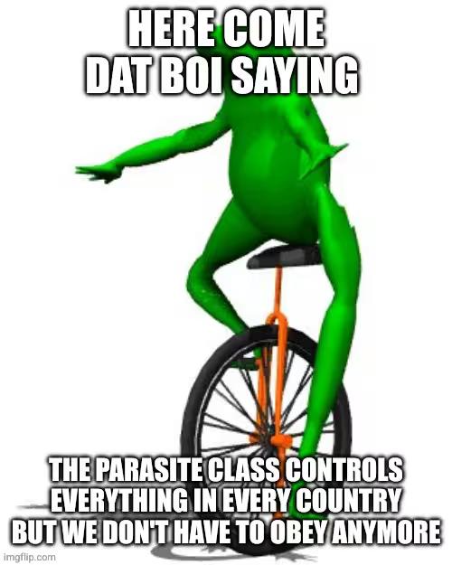 Top text: Here come dat boi saying Green frog riding on an orange unicycle Bottom text: The parasite class controls everything in every country but we don't have to obey anymore