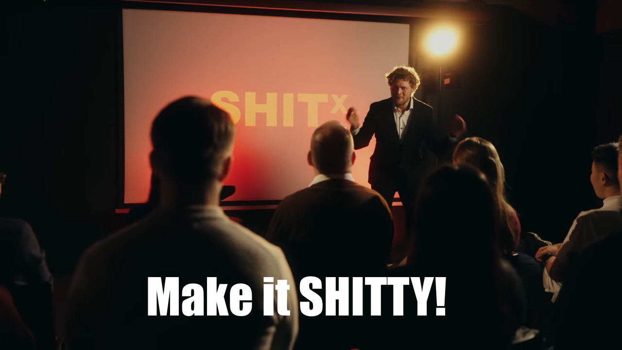 Guy giving presentation to a crowd, showing slide that says Shit× and saying "Make it SHITTY!"