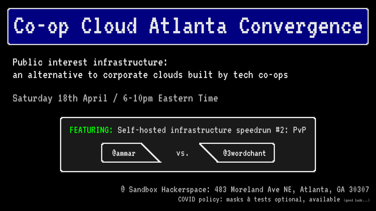 A lo-fi event flyer with monospace font on a black background. Co-op Cloud Atlanta Convergence Public interest infrastructure: an alternative to corporate clouds built by tech co-ops Saturday 18th April / 6-10pm Eastern Time FEATURING: Self-hosted infrastructure speedrun #2: PvP @ammar vs. @3wordchant @ Sandbox Hackerspace: 483 Moreland Ave NE, Atlanta, GA 30307 COVID policy: masks & tests optional, available (good luck...)