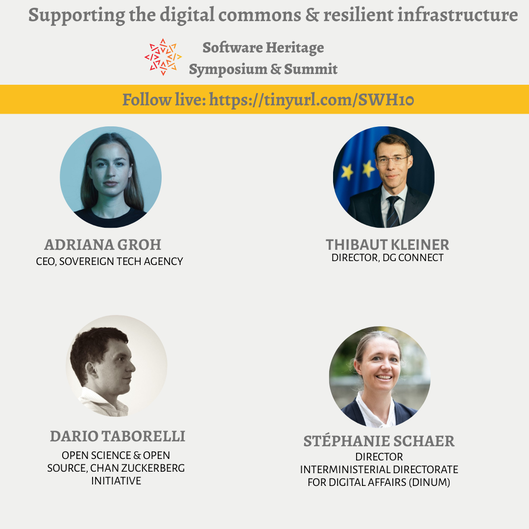 Up next at the Software Heritage Symposium: Supporting the digital commons to secure our invisible infrastructure with: Sovereign Tech Agency • DINUM (France) • Chan Zuckerberg Initiative • DG CONNECT (EC) Watch live: https://tinyurl.com/SWH10 #OpenSource