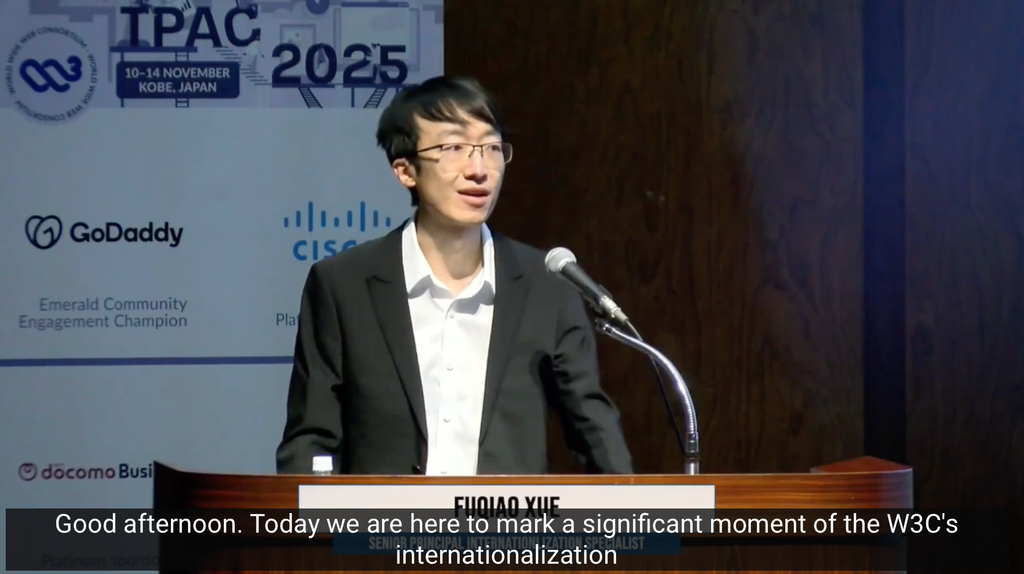 During the November 2025 TPAC week, Fuqiao Xue, W3C Senior Principal Internationlization Specialist, honored Addison Phillips for over 20 years of leading W3C’s internationalization work, welcomed new chair Joel Sahleen, and highlighted recent I18N achievements. He also called for continued community participation to ensure the web works for all languages and cultures.