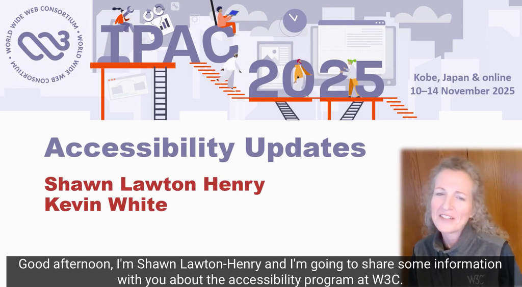 At the November 2025 TPAC event, Kevin White, W3C Senior Principal Accessibility Specialist, gave an overview of W3C accessibility work over the past year, covering key groups like the Accessibility Guidelines, ARIA, APA, and WAI Interest Group. Highlights include updates to WCAG 2 and WCAG 3 drafts, ACT Rules, WCAG2ICT, test suites, and resources. Future work includes WCAG 3 publication, accessibility for AI, and spoken presentation specs.