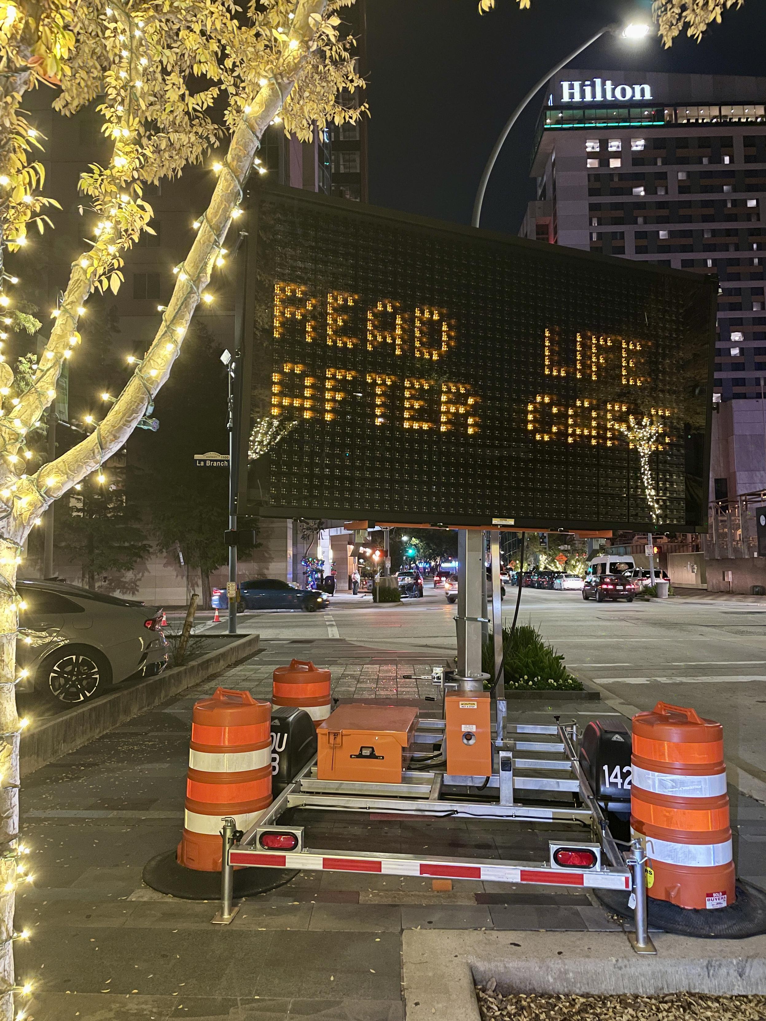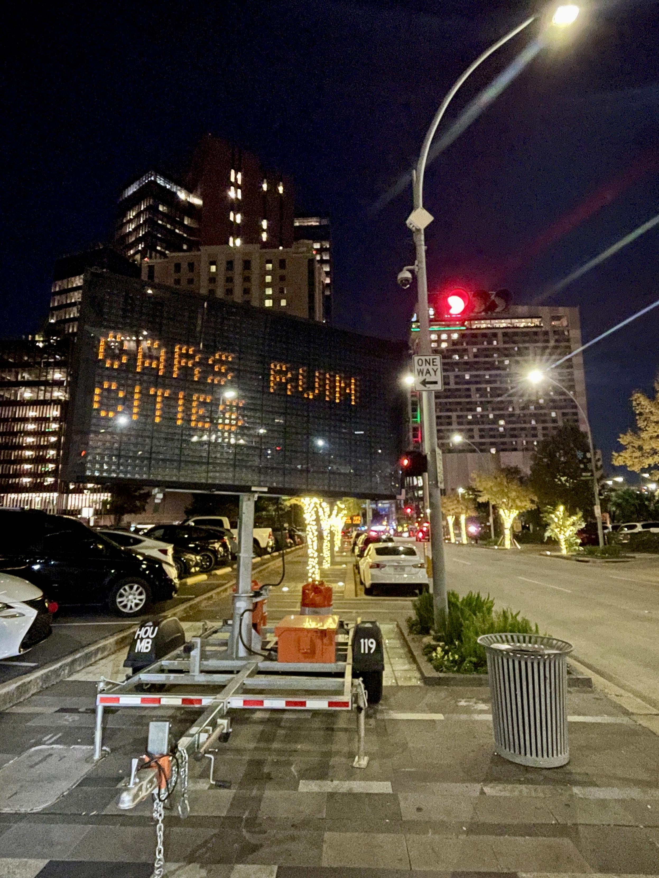 Spotted in Houston: two hacked variable message signs. That the signs were placed on the sidewalk, blocking pedestrian access, makes the messages all the more urgent.