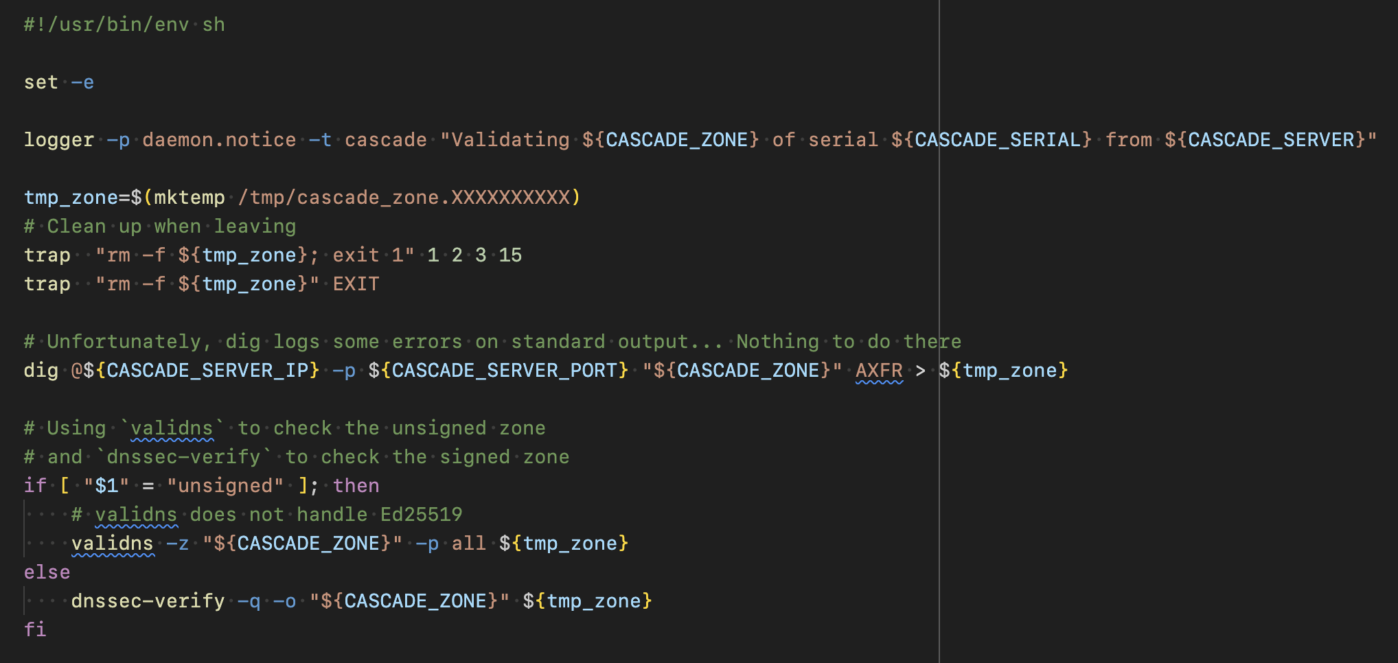 A bash script that shows how Cascade’s review hooks can use validns to validate the unsigned zone, and dnssec-verify to validate the signed zone.