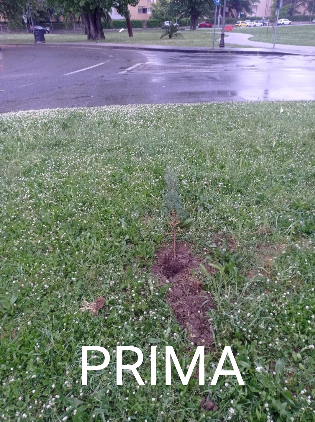 una giovane cipresso scalzato dalla sua sede e atterrato in un aiuola vicino a una strada. in sovraimpressione c'è scritto PRIMA.