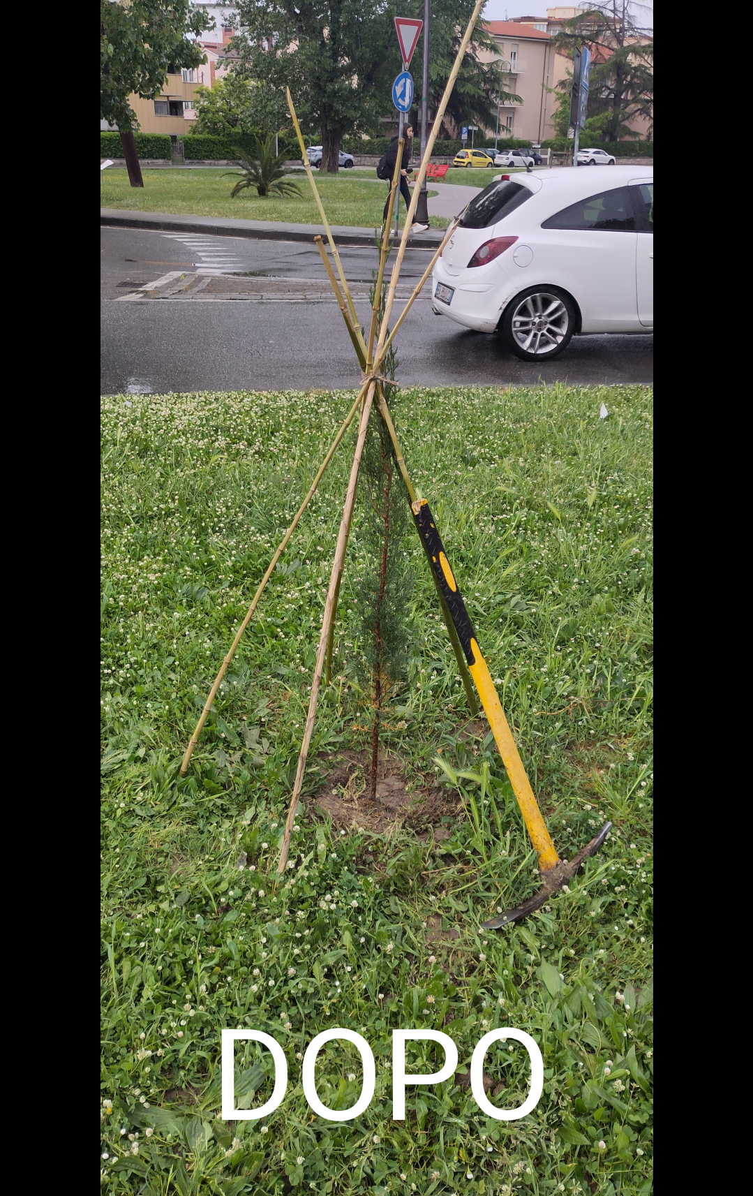 un giovane cipresso in un aiuola vicino alla strada protetto da un cannicciato fatto a tee-pee, con sopra appoggiato un piccone dal manico di plastica giallo