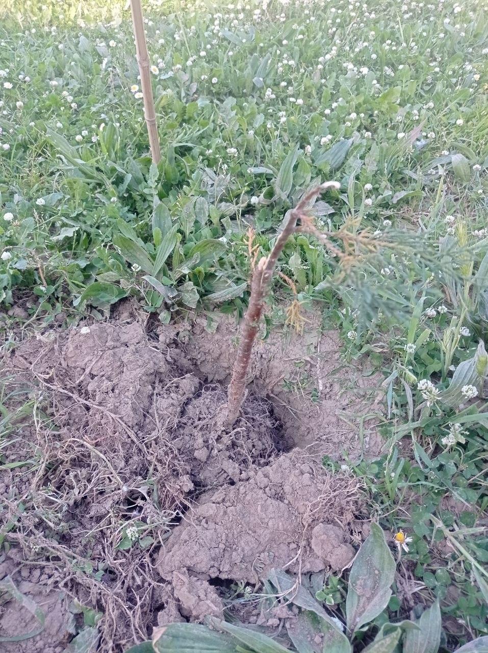 Purtroppo, quando non combatti il caldo, c'è sempre il nemico antropico: qualcuno si è preso la briga di rimuovere i bastoni segnalatori e buttare per terra il cipresso appena piantato. 🌲